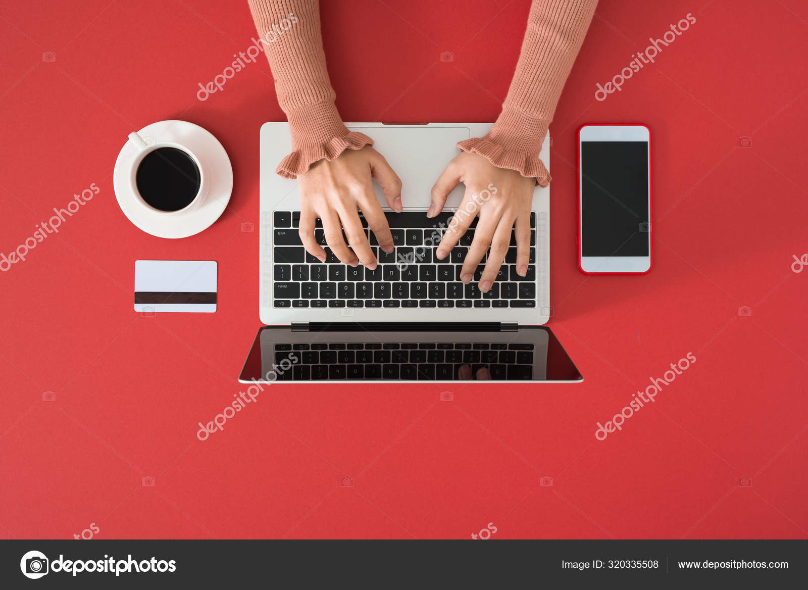 ノートパソコンで作業する赤いマニキュアの手 Frestocks フリストックス フリー素材やモデル写真